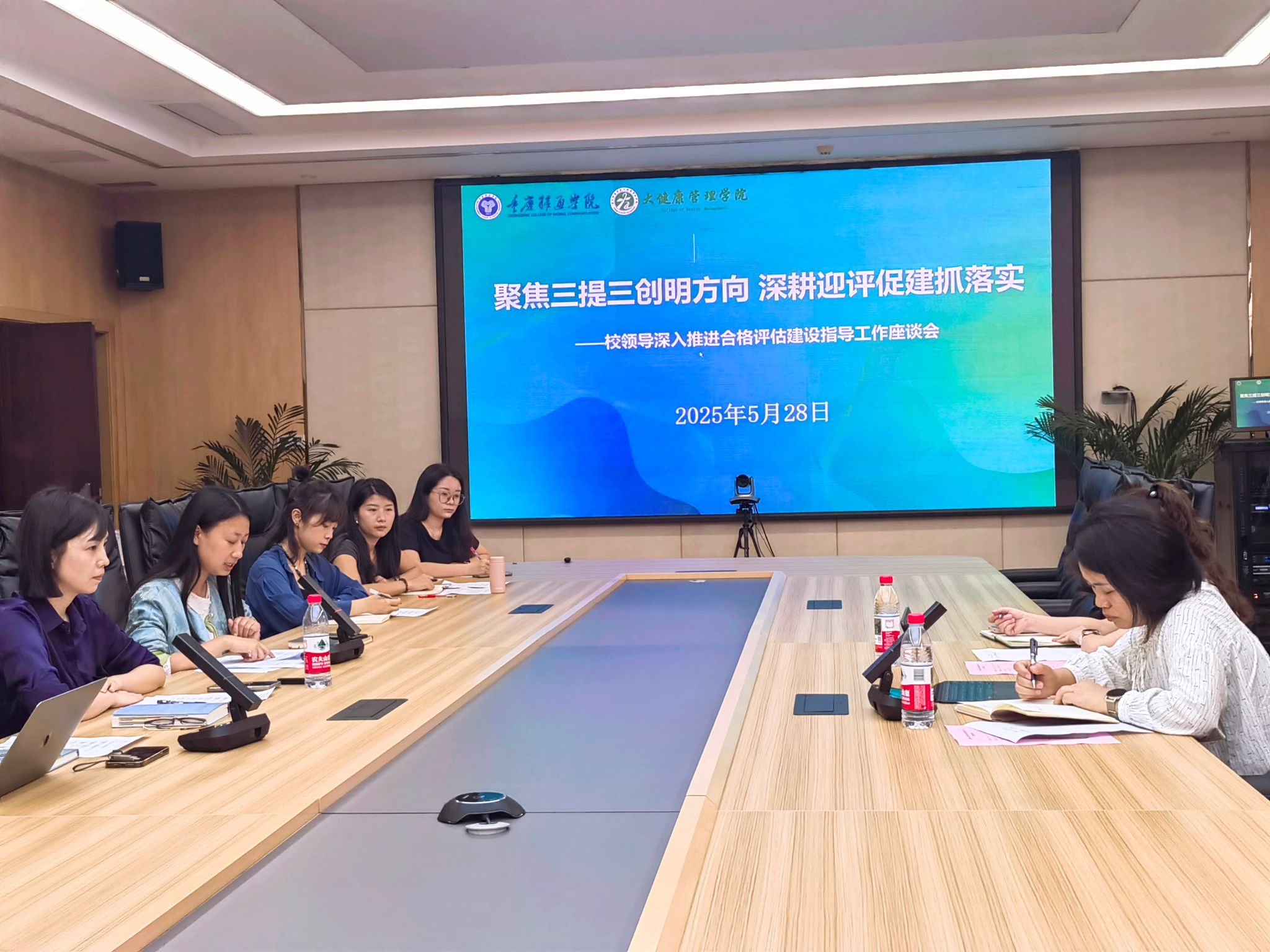 2025年5月28日,校领导深入推进合格评估建设指导工作座谈会在瀛山图书馆会议室举行。参加会议的有校长助理谢银平、教务处科长谭臣臣、大健康管理学院院长杨瑜、教研室主任姜晴秋、学工办主任童学容及合格评估各版块负责老师。会议对评估工作进展进行全面梳理,聚焦难点精准施策,为高质量迎接评估凝聚合力、明确方向。